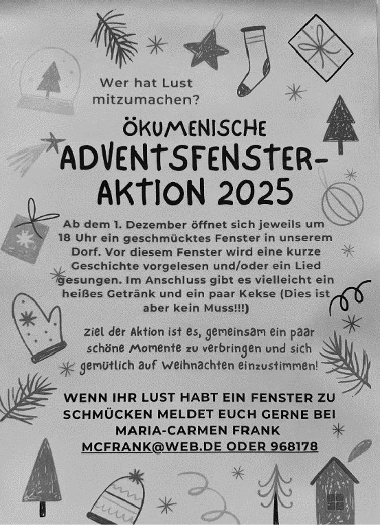 Aufruf zum Mitmachen beim "Lebendigen Adventskalender", Advents-und Bastelnachmittag am 02.12. in Gleisweiler; Aufruf zum Mitmachen beim Krippenspiel in Edesheim; Konzert MAINZER HOFSÄNGER in Rhodt am 07.12.2025